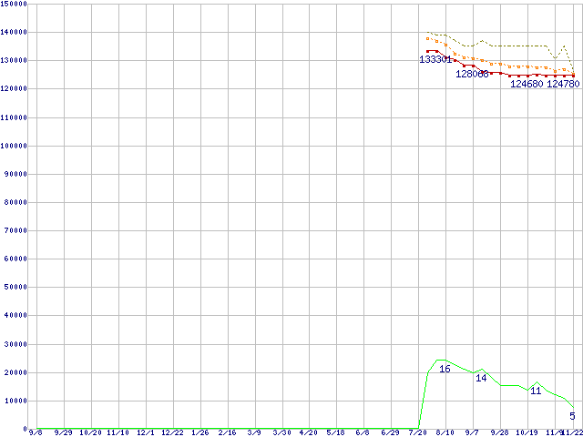 ※このグラフは過去のデータも税率5%相当に調整した税込み相当額のグラフです。 税率変更や、総額表示方式導入(2004年4月)の影響は除いています。 | | | ●凡例 | 最安値 (点線部は販売店未確認 または未調査) | 平均値 | 最高値 | ショップ数 |