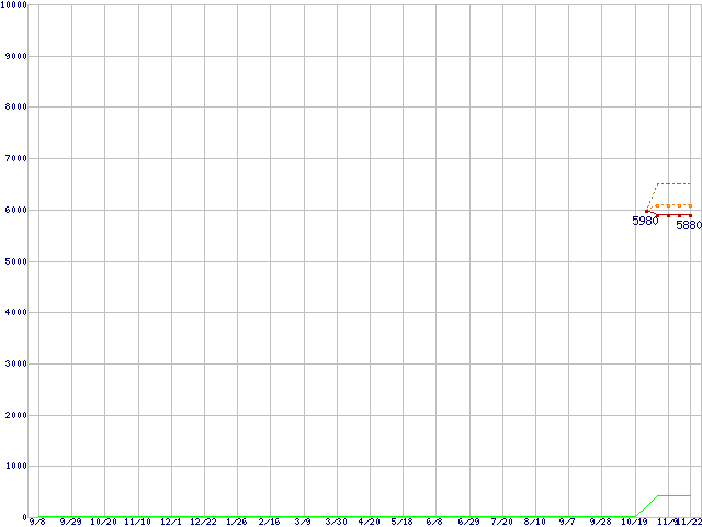 ※このグラフは過去のデータも税率5%相当に調整した税込み相当額のグラフです。 税率変更や、総額表示方式導入(2004年4月)の影響は除いています。 | | | ●凡例 | 最安値 (点線部は販売店未確認 または未調査) | 平均値 | 最高値 | ショップ数 |