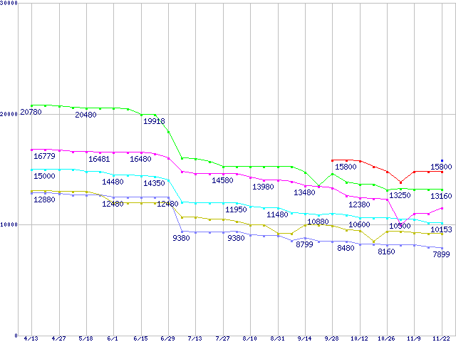 | Socket AM2 (HyperTransport,Dual Core,TDP 65W)の最安値推移 | | | (2007年4月13日~2007年11月22日) |