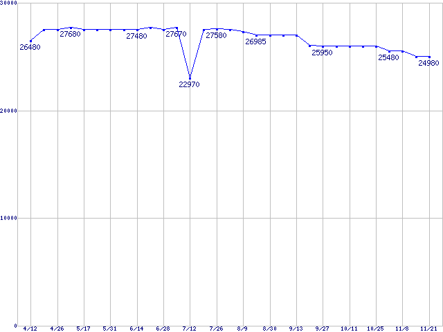 | WD Raptor X (10000rpm,SATA 1.5Gb/s,16MB,NCQ)の最安値推移 | | | (2007年4月12日~2007年11月21日) |