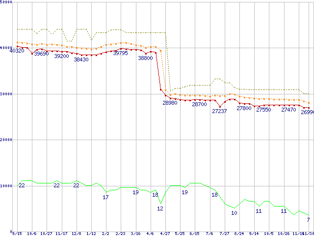 | Core 2 Duo E6600 (2.40GHz,L2 4MB)の価格推移 | | | (2006年9月15日~2007年11月30日) |