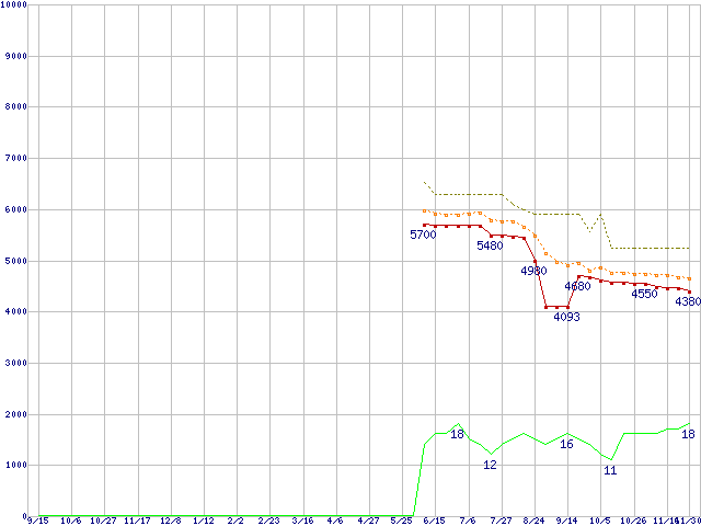 ※このグラフは過去のデータも税率5%相当に調整した税込み相当額のグラフです。 税率変更や、総額表示方式導入(2004年4月)の影響は除いています。 | | | ●凡例 | 最安値 (点線部は販売店未確認 または未調査) | 平均値 | 最高値 | ショップ数 |