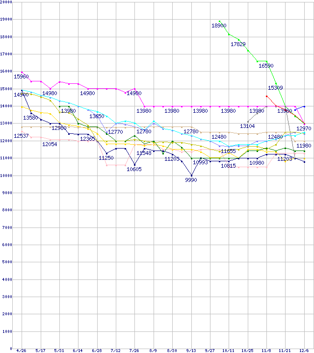 | HDD主要製品(最安値1万円~1万5千円未満)の最安値推移 | | | (2007年4月26日~2007年12月6日) |
