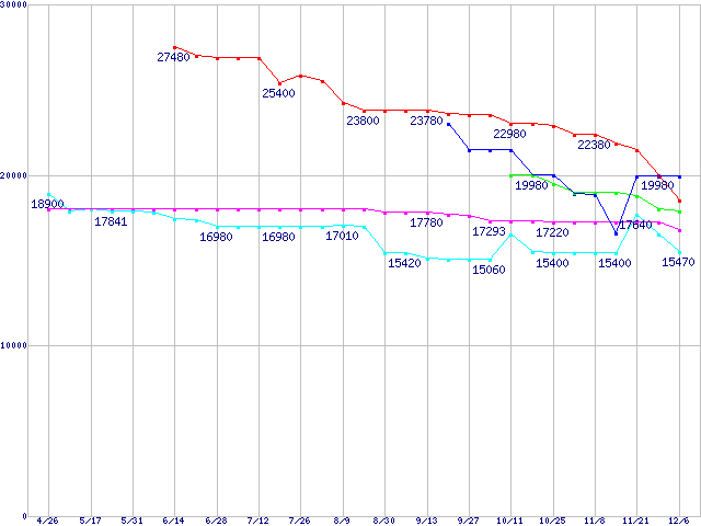HDD主要製品(最安値1万5千円~2万円未満)の最安値推移