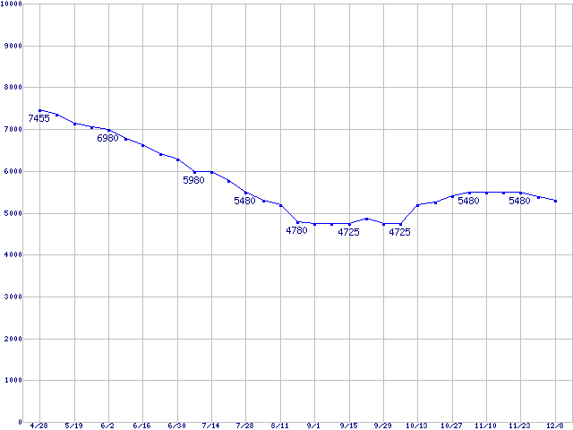 | メモリ主要製品(最安値5千円~1万円未満)の最安値推移 | | | (2007年4月28日~2007年12月8日) |