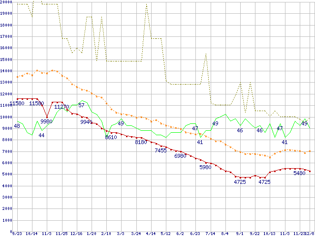 ※このグラフは過去のデータも税率5%相当に調整した税込み相当額のグラフです。 税率変更や、総額表示方式導入(2004年4月)の影響は除いています。 | | | ●凡例 | 最安値 (点線部は販売店未確認 または未調査) | 平均値 | 最高値 | ショップ数 |