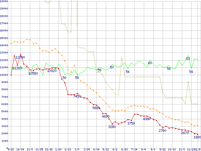 ※このグラフは過去のデータも税率5%相当に調整した税込み相当額のグラフです。 税率変更や、総額表示方式導入(2004年4月)の影響は除いています。 | | | ●凡例 | 最安値 (点線部は販売店未確認 または未調査) | 平均値 | 最高値 | ショップ数 |