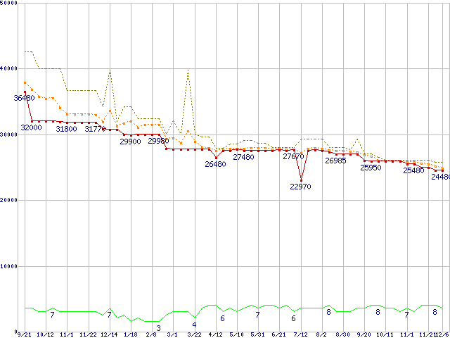 ※このグラフは過去のデータも税率5%相当に調整した税込み相当額のグラフです。 税率変更や、総額表示方式導入(2004年4月)の影響は除いています。 | | | ●凡例 | 最安値 (点線部は販売店未確認 または未調査) | 平均値 | 最高値 | ショップ数 |