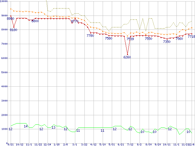 ※このグラフは過去のデータも税率5%相当に調整した税込み相当額のグラフです。 税率変更や、総額表示方式導入(2004年4月)の影響は除いています。 | | | ●凡例 | 最安値 (点線部は販売店未確認 または未調査) | 平均値 | 最高値 | ショップ数 |