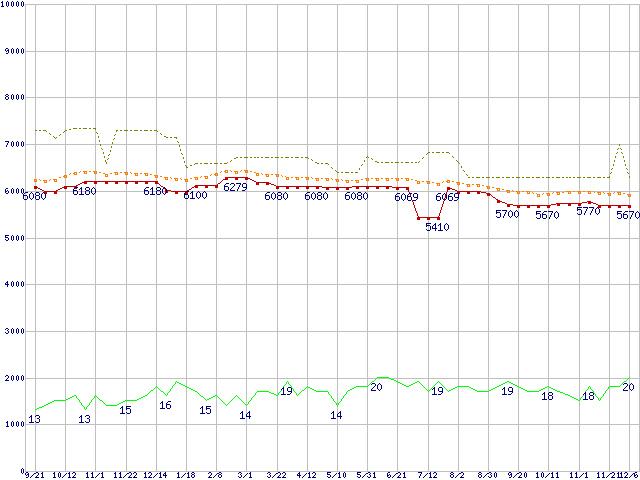 ※このグラフは過去のデータも税率5%相当に調整した税込み相当額のグラフです。 税率変更や、総額表示方式導入(2004年4月)の影響は除いています。 | | | ●凡例 | 最安値 (点線部は販売店未確認 または未調査) | 平均値 | 最高値 | ショップ数 |