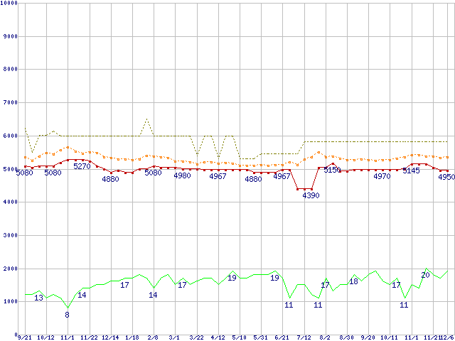 ※このグラフは過去のデータも税率5%相当に調整した税込み相当額のグラフです。 税率変更や、総額表示方式導入(2004年4月)の影響は除いています。 | | | ●凡例 | 最安値 (点線部は販売店未確認 または未調査) | 平均値 | 最高値 | ショップ数 |