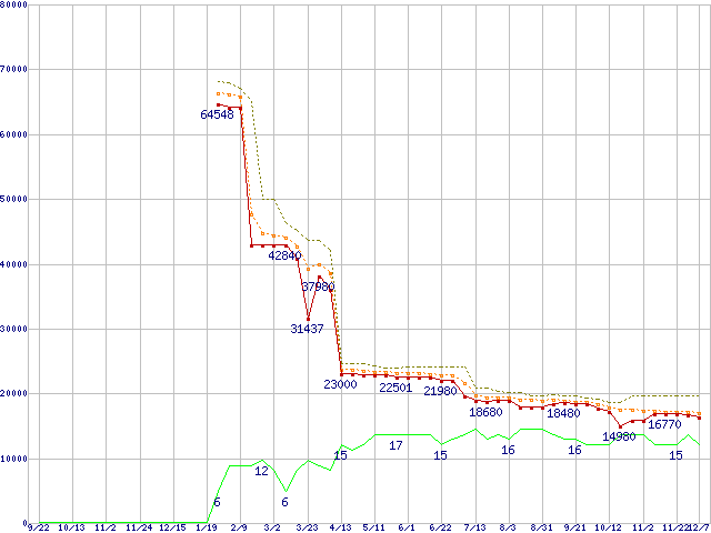 ※このグラフは過去のデータも税率5%相当に調整した税込み相当額のグラフです。 税率変更や、総額表示方式導入(2004年4月)の影響は除いています。 | | | ●凡例 | 最安値 (点線部は販売店未確認 または未調査) | 平均値 | 最高値 | ショップ数 |