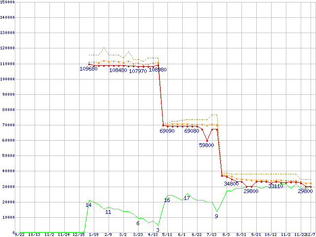 ※このグラフは過去のデータも税率5%相当に調整した税込み相当額のグラフです。 税率変更や、総額表示方式導入(2004年4月)の影響は除いています。 | | | ●凡例 | 最安値 (点線部は販売店未確認 または未調査) | 平均値 | 最高値 | ショップ数 |