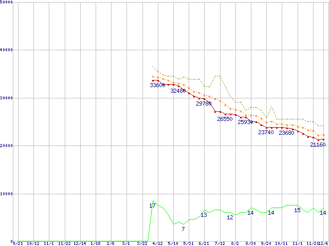 ※このグラフは過去のデータも税率5%相当に調整した税込み相当額のグラフです。 税率変更や、総額表示方式導入(2004年4月)の影響は除いています。 | | | ●凡例 | 最安値 (点線部は販売店未確認 または未調査) | 平均値 | 最高値 | ショップ数 |