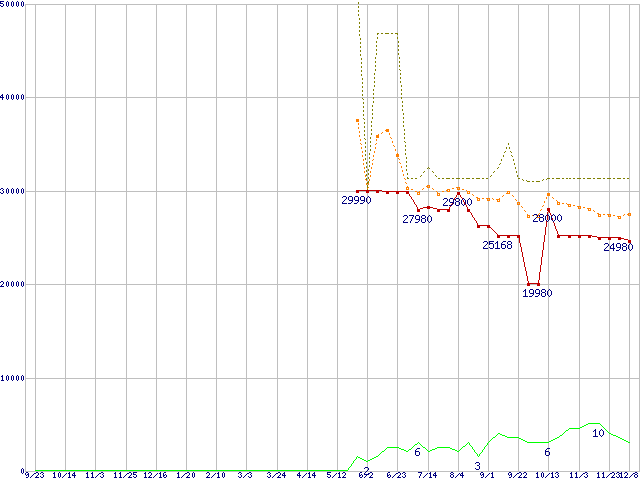 ※このグラフは過去のデータも税率5%相当に調整した税込み相当額のグラフです。 税率変更や、総額表示方式導入(2004年4月)の影響は除いています。 | | | ●凡例 | 最安値 (点線部は販売店未確認 または未調査) | 平均値 | 最高値 | ショップ数 |