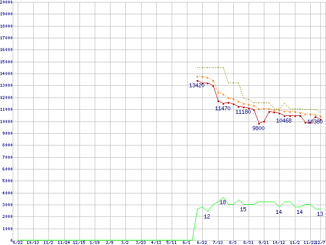 ※このグラフは過去のデータも税率5%相当に調整した税込み相当額のグラフです。 税率変更や、総額表示方式導入(2004年4月)の影響は除いています。 | | | ●凡例 | 最安値 (点線部は販売店未確認 または未調査) | 平均値 | 最高値 | ショップ数 |