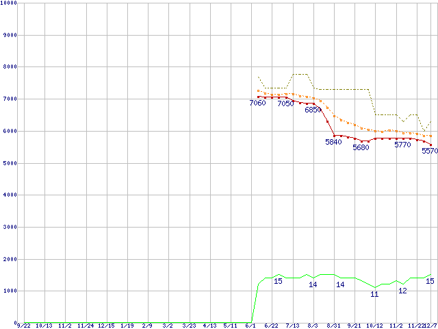 ※このグラフは過去のデータも税率5%相当に調整した税込み相当額のグラフです。 税率変更や、総額表示方式導入(2004年4月)の影響は除いています。 | | | ●凡例 | 最安値 (点線部は販売店未確認 または未調査) | 平均値 | 最高値 | ショップ数 |