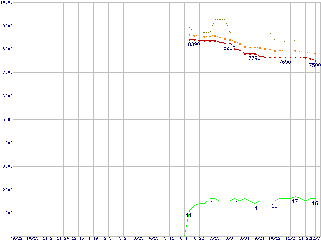 ※このグラフは過去のデータも税率5%相当に調整した税込み相当額のグラフです。 税率変更や、総額表示方式導入(2004年4月)の影響は除いています。 | | | ●凡例 | 最安値 (点線部は販売店未確認 または未調査) | 平均値 | 最高値 | ショップ数 |