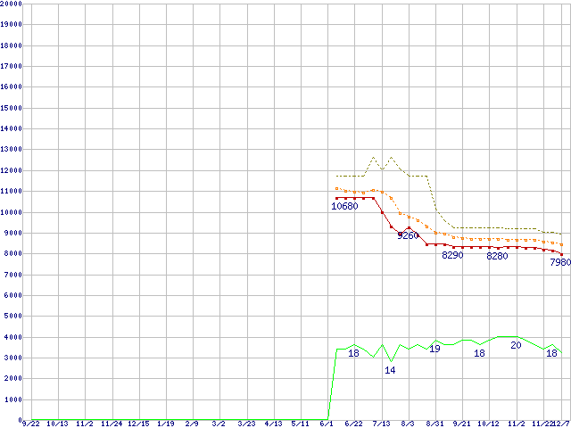 ※このグラフは過去のデータも税率5%相当に調整した税込み相当額のグラフです。 税率変更や、総額表示方式導入(2004年4月)の影響は除いています。 | | | ●凡例 | 最安値 (点線部は販売店未確認 または未調査) | 平均値 | 最高値 | ショップ数 |