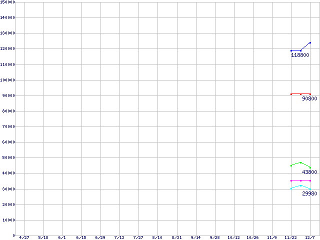 | LGA771(FSB 1333MHz,Quad Core,L2 6MB×2,TDP 80W)の最安値推移 | | | (2007年4月27日~2007年12月7日) |