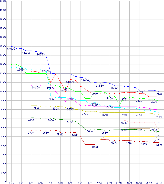 | CPU主要製品(最安値1万円未満)の最安値推移 | | | (2007年5月11日~2007年12月14日) |