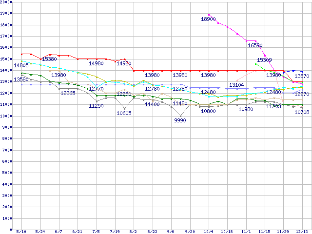 HDD主要製品(最安値1万円~1万5千円未満)の最安値推移
