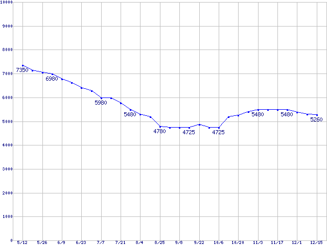 | メモリ主要製品(最安値5千円~1万円未満)の最安値推移 | | | (2007年5月12日~2007年12月15日) |