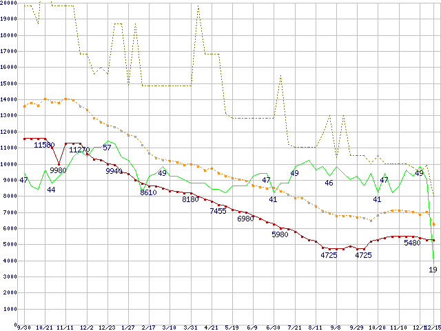 ※このグラフは過去のデータも税率5%相当に調整した税込み相当額のグラフです。 税率変更や、総額表示方式導入(2004年4月)の影響は除いています。 | | | ●凡例 | 最安値 (点線部は販売店未確認 または未調査) | 平均値 | 最高値 | ショップ数 |