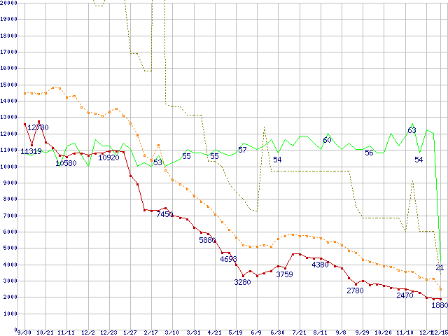 ※このグラフは過去のデータも税率5%相当に調整した税込み相当額のグラフです。 税率変更や、総額表示方式導入(2004年4月)の影響は除いています。 | | | ●凡例 | 最安値 (点線部は販売店未確認 または未調査) | 平均値 | 最高値 | ショップ数 |