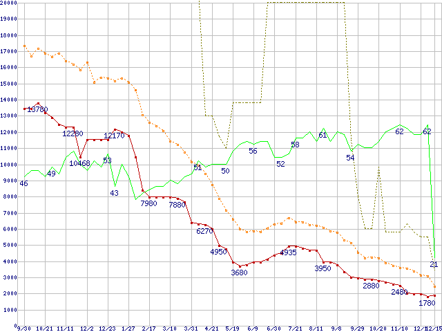 ※このグラフは過去のデータも税率5%相当に調整した税込み相当額のグラフです。 税率変更や、総額表示方式導入(2004年4月)の影響は除いています。 | | | ●凡例 | 最安値 (点線部は販売店未確認 または未調査) | 平均値 | 最高値 | ショップ数 |