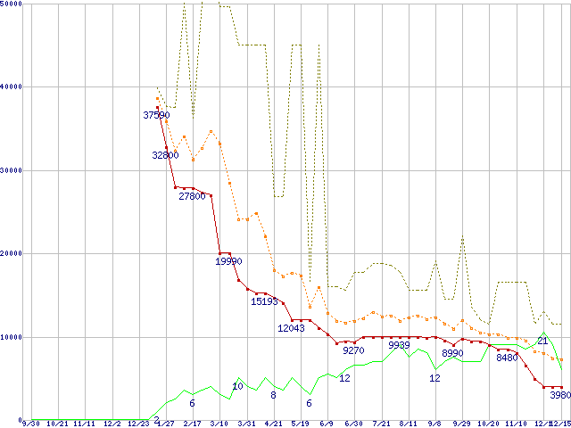 ※このグラフは過去のデータも税率5%相当に調整した税込み相当額のグラフです。 税率変更や、総額表示方式導入(2004年4月)の影響は除いています。 | | | ●凡例 | 最安値 (点線部は販売店未確認 または未調査) | 平均値 | 最高値 | ショップ数 |