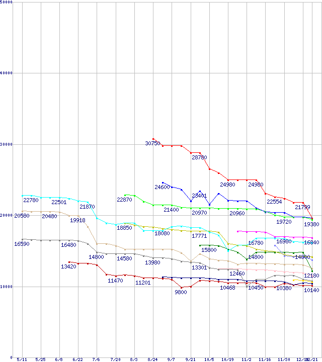 | CPU主要製品(最安値1万円~2万円未満)の最安値推移 | | | (2007年5月11日~2007年12月21日) |