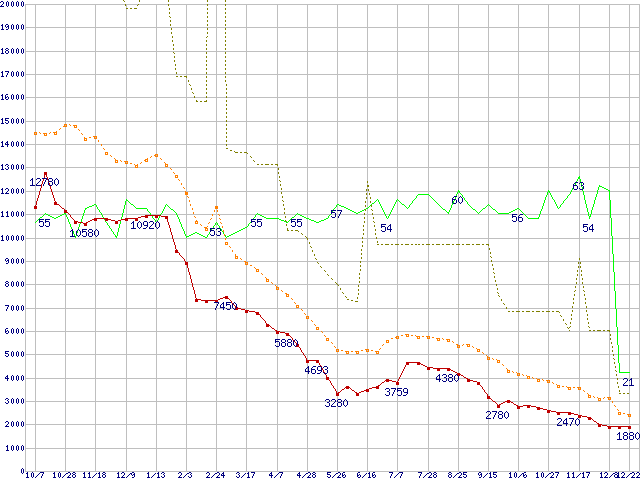 ※このグラフは過去のデータも税率5%相当に調整した税込み相当額のグラフです。 税率変更や、総額表示方式導入(2004年4月)の影響は除いています。 | | | ●凡例 | 最安値 (点線部は販売店未確認 または未調査) | 平均値 | 最高値 | ショップ数 |