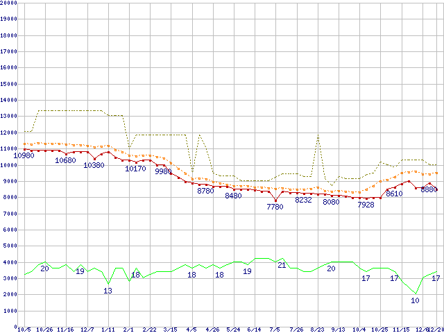 ※このグラフは過去のデータも税率5%相当に調整した税込み相当額のグラフです。 税率変更や、総額表示方式導入(2004年4月)の影響は除いています。 | | | ●凡例 | 最安値 (点線部は販売店未確認 または未調査) | 平均値 | 最高値 | ショップ数 |