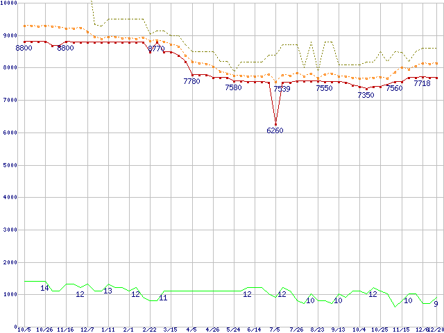 ※このグラフは過去のデータも税率5%相当に調整した税込み相当額のグラフです。 税率変更や、総額表示方式導入(2004年4月)の影響は除いています。 | | | ●凡例 | 最安値 (点線部は販売店未確認 または未調査) | 平均値 | 最高値 | ショップ数 |