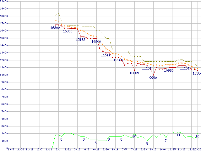 ※このグラフは過去のデータも税率5%相当に調整した税込み相当額のグラフです。 税率変更や、総額表示方式導入(2004年4月)の影響は除いています。 | | | ●凡例 | 最安値 (点線部は販売店未確認 または未調査) | 平均値 | 最高値 | ショップ数 |