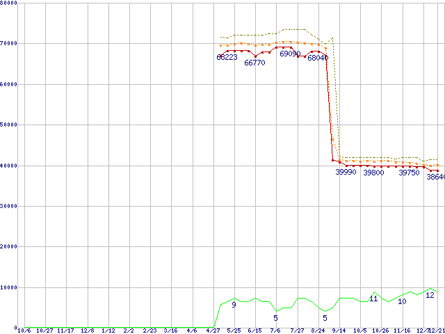 ※このグラフは過去のデータも税率5%相当に調整した税込み相当額のグラフです。 税率変更や、総額表示方式導入(2004年4月)の影響は除いています。 | | | ●凡例 | 最安値 (点線部は販売店未確認 または未調査) | 平均値 | 最高値 | ショップ数 |