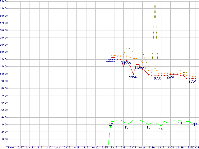 ※このグラフは過去のデータも税率5%相当に調整した税込み相当額のグラフです。 税率変更や、総額表示方式導入(2004年4月)の影響は除いています。 | | | ●凡例 | 最安値 (点線部は販売店未確認 または未調査) | 平均値 | 最高値 | ショップ数 |
