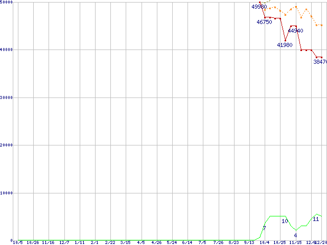 ※このグラフは過去のデータも税率5%相当に調整した税込み相当額のグラフです。 税率変更や、総額表示方式導入(2004年4月)の影響は除いています。 | | | ●凡例 | 最安値 (点線部は販売店未確認 または未調査) | 平均値 | 最高値 | ショップ数 |