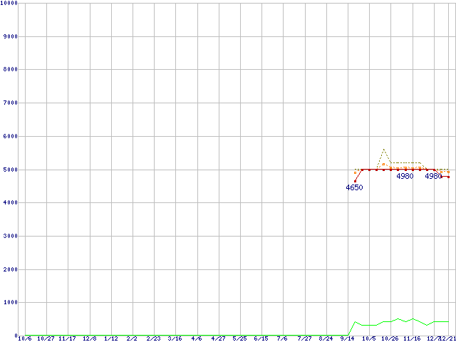 ※このグラフは過去のデータも税率5%相当に調整した税込み相当額のグラフです。 税率変更や、総額表示方式導入(2004年4月)の影響は除いています。 | | | ●凡例 | 最安値 (点線部は販売店未確認 または未調査) | 平均値 | 最高値 | ショップ数 |