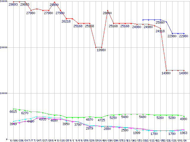 メモリ主要製品(最安値5千円未満)の最安値推移
