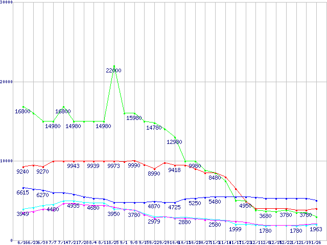 メモリ主要製品(最安値5千円未満)の最安値推移