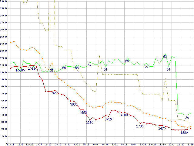 ※このグラフは過去のデータも税率5%相当に調整した税込み相当額のグラフです。 税率変更や、総額表示方式導入(2004年4月)の影響は除いています。 | | | ●凡例 | 最安値 (点線部は販売店未確認 または未調査) | 平均値 | 最高値 | ショップ数 |