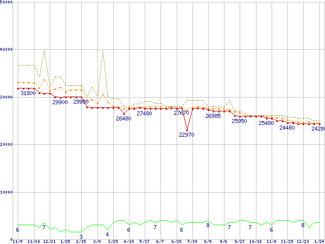 ※このグラフは過去のデータも税率5%相当に調整した税込み相当額のグラフです。 税率変更や、総額表示方式導入(2004年4月)の影響は除いています。 | | | ●凡例 | 最安値 (点線部は販売店未確認 または未調査) | 平均値 | 最高値 | ショップ数 |
