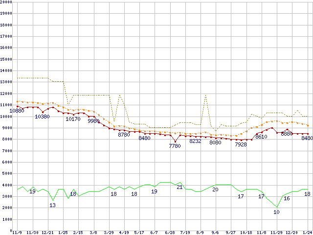 ※このグラフは過去のデータも税率5%相当に調整した税込み相当額のグラフです。 税率変更や、総額表示方式導入(2004年4月)の影響は除いています。 | | | ●凡例 | 最安値 (点線部は販売店未確認 または未調査) | 平均値 | 最高値 | ショップ数 |