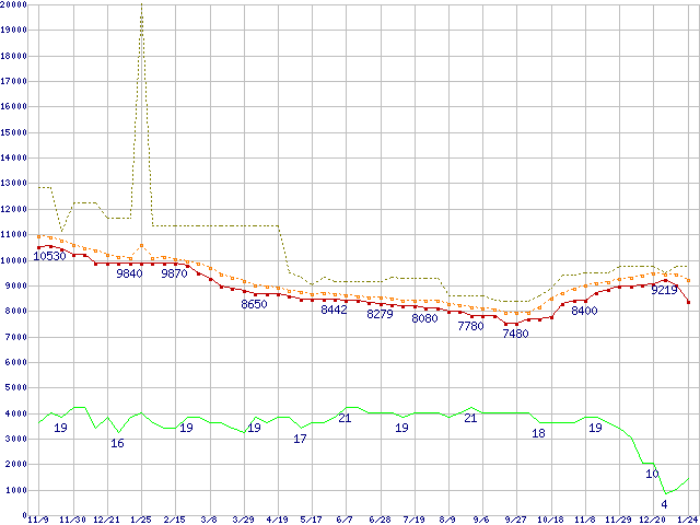 ※このグラフは過去のデータも税率5%相当に調整した税込み相当額のグラフです。 税率変更や、総額表示方式導入(2004年4月)の影響は除いています。 | | | ●凡例 | 最安値 (点線部は販売店未確認 または未調査) | 平均値 | 最高値 | ショップ数 |
