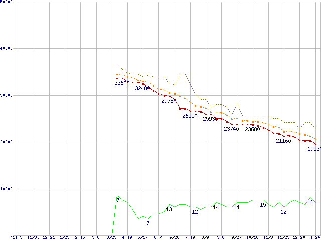 ※このグラフは過去のデータも税率5%相当に調整した税込み相当額のグラフです。 税率変更や、総額表示方式導入(2004年4月)の影響は除いています。 | | | ●凡例 | 最安値 (点線部は販売店未確認 または未調査) | 平均値 | 最高値 | ショップ数 |