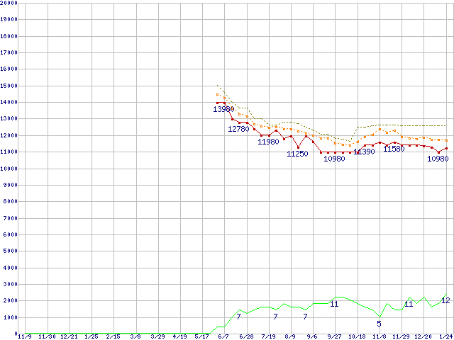 ※このグラフは過去のデータも税率5%相当に調整した税込み相当額のグラフです。 税率変更や、総額表示方式導入(2004年4月)の影響は除いています。 | | | ●凡例 | 最安値 (点線部は販売店未確認 または未調査) | 平均値 | 最高値 | ショップ数 |