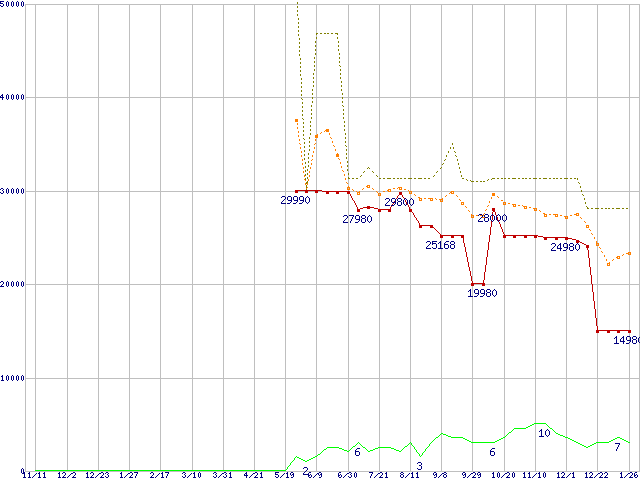 ※このグラフは過去のデータも税率5%相当に調整した税込み相当額のグラフです。 税率変更や、総額表示方式導入(2004年4月)の影響は除いています。 | | | ●凡例 | 最安値 (点線部は販売店未確認 または未調査) | 平均値 | 最高値 | ショップ数 |