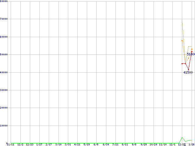 ※このグラフは過去のデータも税率5%相当に調整した税込み相当額のグラフです。 税率変更や、総額表示方式導入(2004年4月)の影響は除いています。 | | | ●凡例 | 最安値 (点線部は販売店未確認 または未調査) | 平均値 | 最高値 | ショップ数 |